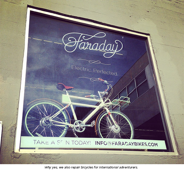 What brought these two to our door? Pablo and Olga have been riding their bikes for the past two years, from Spain to Russia, then across the Pacific (by plane or boat, hopefully…) to Alaska, where they’d ridden down to California, on their way to Patagonia at the tip of South America. By the time they reached San Francisco, though, the dampness of the city’s epic fog got the better of the headlight on Olga’s bike, and the electrical connectors attaching it to her generator hub became corroded and ceased to function. They had spotted the word “electric” in the window of Faraday’s shop, and came knocking in the hopes we could fix Olga’s light. They came to the right place. We dug up some replacement connectors, attached them to her headlight, and in no time her generator hub was working like new. Just to be on the safe side we sent them packing with a few spare connectors, just in case they had another breakdown in, say, a few thousand miles.
